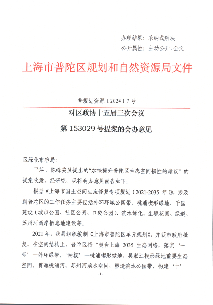 平萍 、陈峰委员提出的“加快提升普陀区生态空间韧性的建议”的提案收悉,经研究,现将会办意见函告如下: