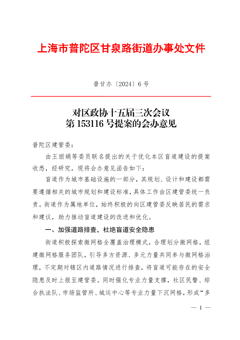 由王丽娟等委员联名提出的关于优化本区盲道建设的提案收悉,经研究,现将会办意见函告如下: