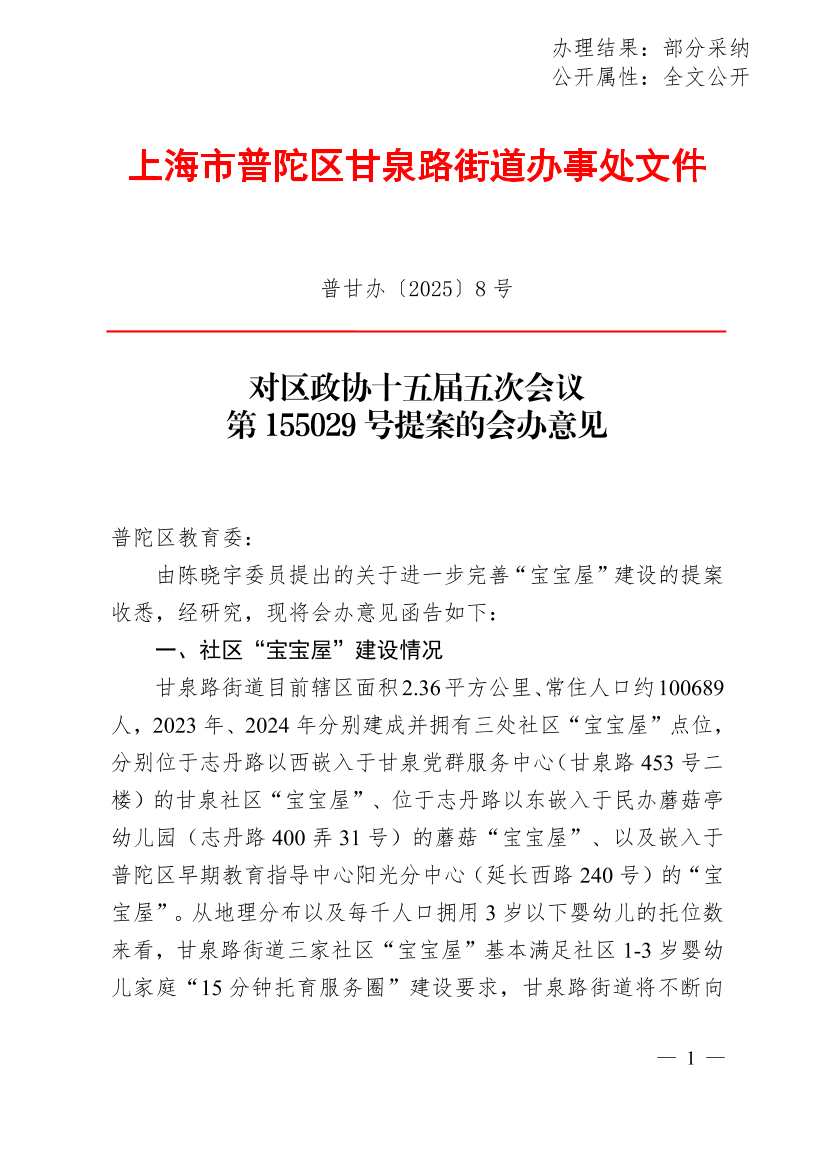 由陈晓宇委员提出的关于进一步完善“宝宝屋”建设的提案收悉,经研究,现将会办意见函告如下: