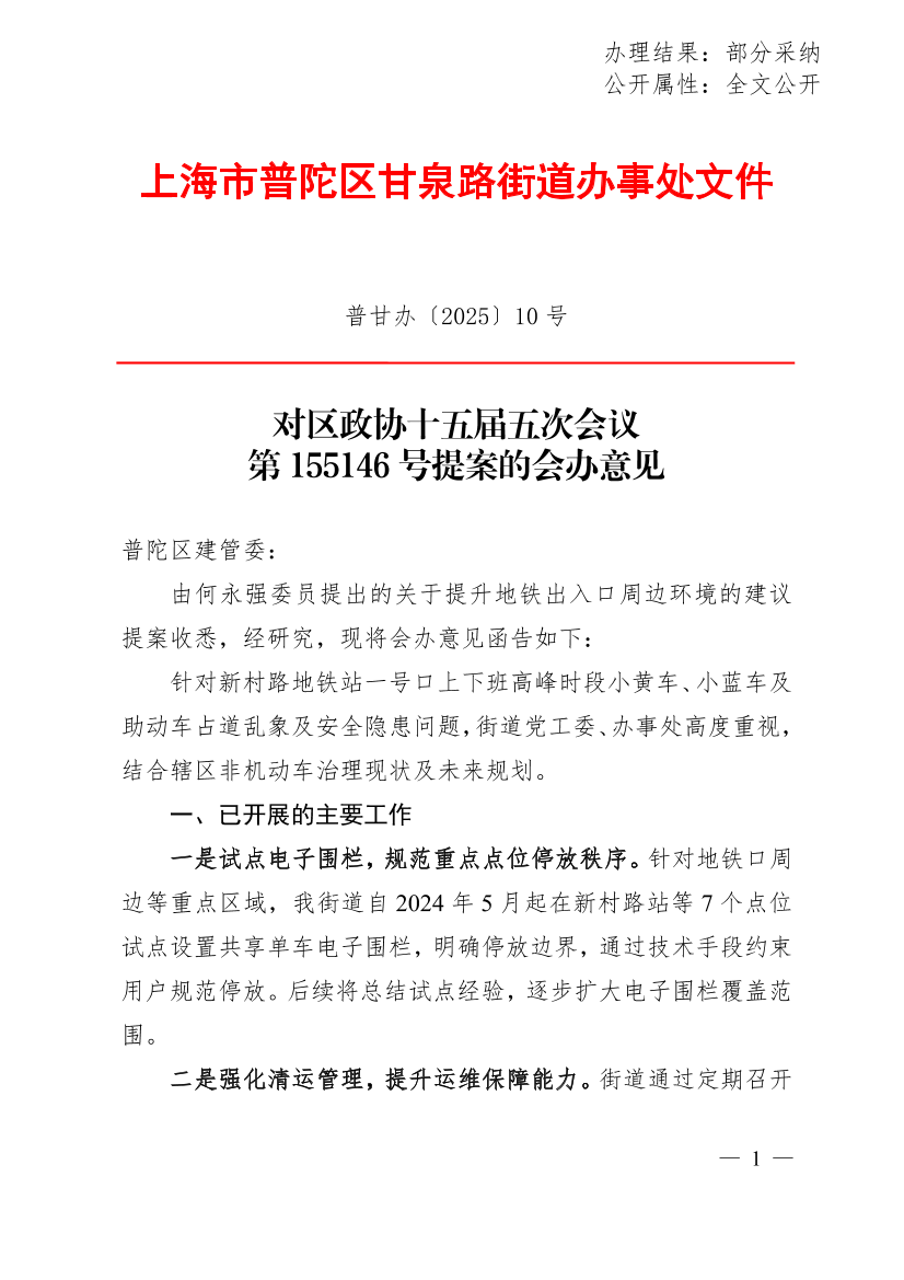由何永强委员提出的关于提升地铁出入口周边环境的建议提案收悉,经研究,现将会办意见函告如下: