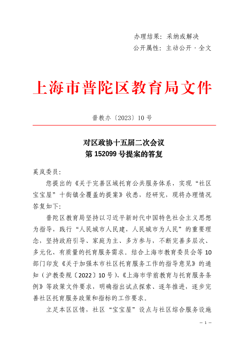 您提出的《关于完善区域托育公共服务体系,实现“社区宝宝屋”十街镇全覆盖的提案》收悉,经研究,现将办理情况答复如下: