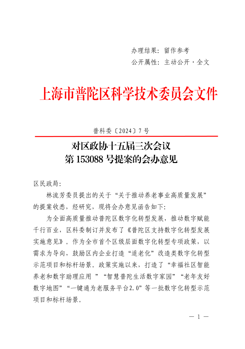 对区政协十五届三次会议第153088号提案的会办意见