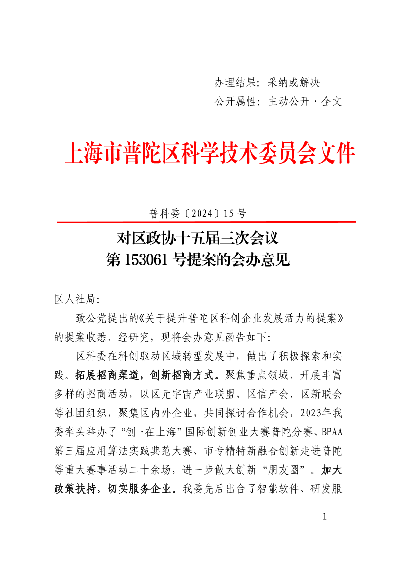 致公党提出的《关于提升普陀区科创企业发展活力的提案》的提案收悉,经研究,现将会办意见函告如下: