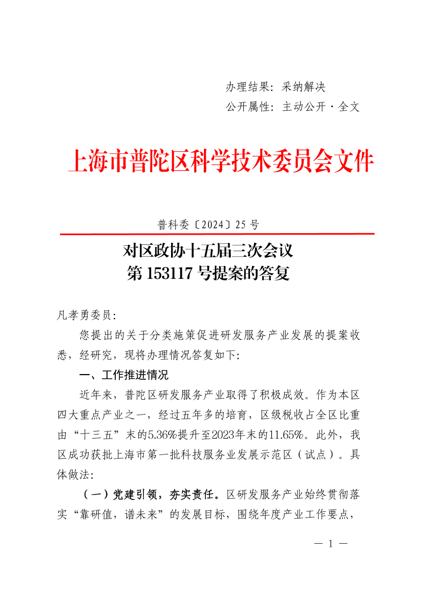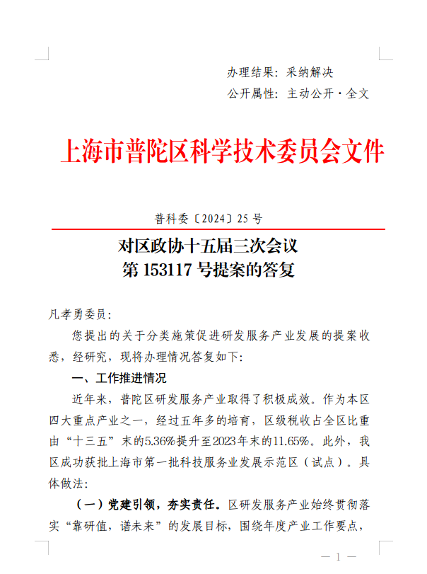 针对研发服务产业存在的发展不均衡、政策不聚焦、定义不清晰的问题,委员相应提出了三点可行的建议,值得政府部门采纳并研究解决。接下来,我区将依托“中华武数”科创布局,不断提升研发服务产业创新能级,做强上海市科技服务业发展示范区,助力普陀构筑新质生产力发展矩阵,谱写新时代普陀高质量发展新篇章。