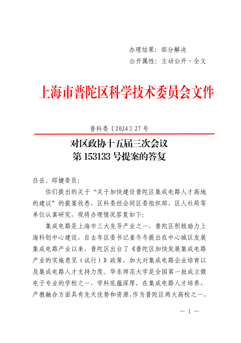 你们提出的关于“关于加快建设普陀区集成电路人才高地的建议”的提案收悉,区科委经会同区委组织部、区人社局等单位认真研究,现将办理情况答复如下: