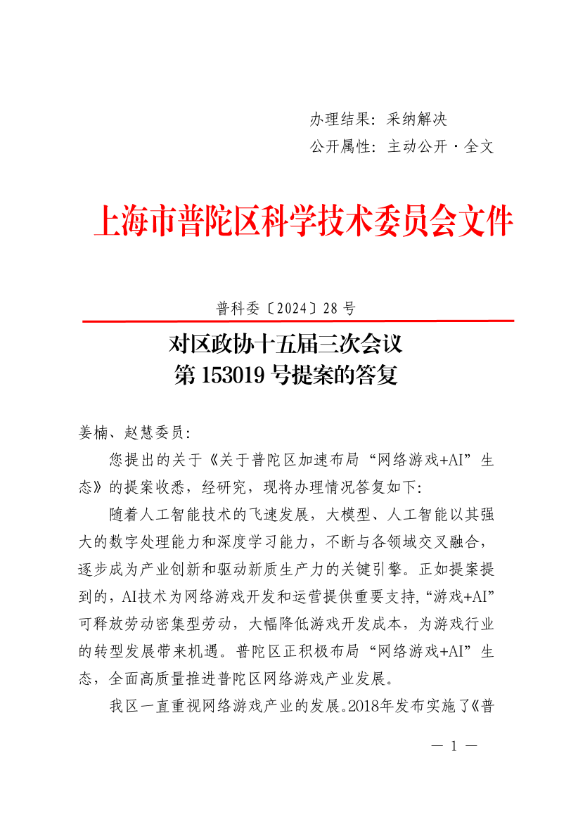 您提出的关于《关于普陀区加速布局“网络游戏+AI”生态》的提案收悉,经研究,现将办理情况答复如下: