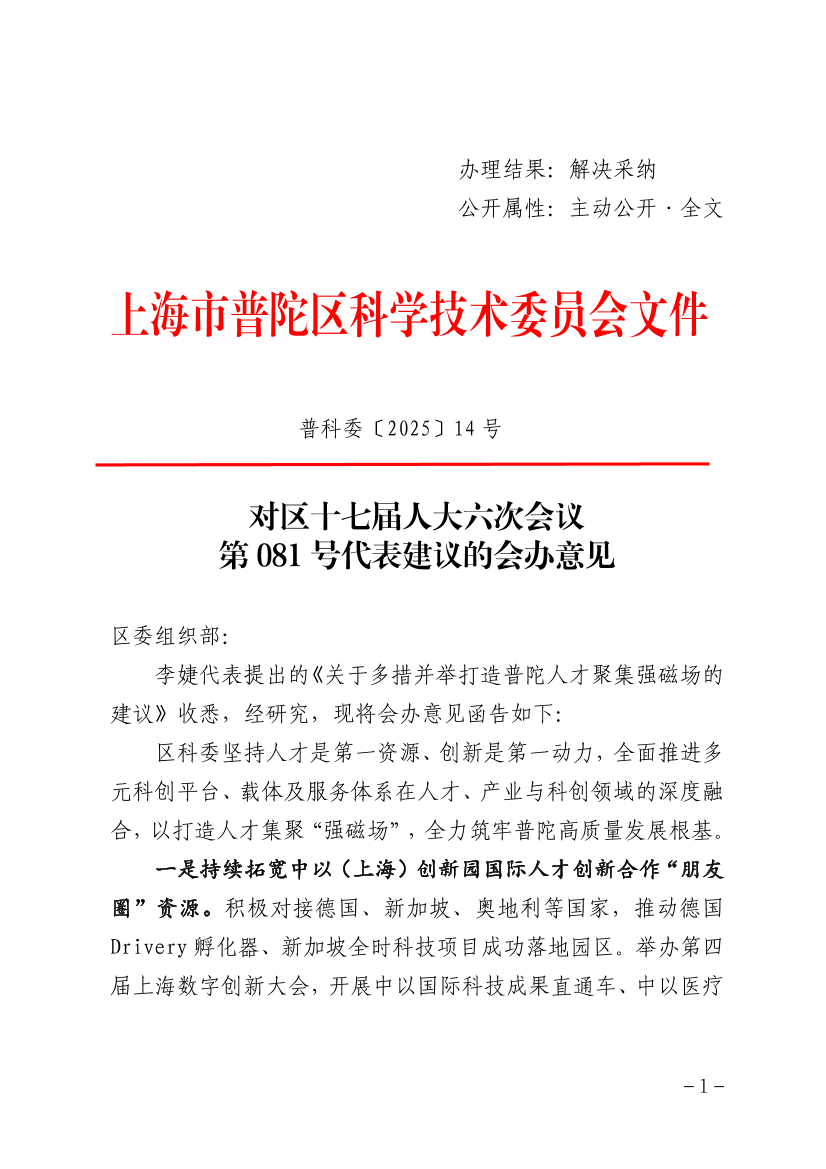 李婕代表提出的《关于多措并举打造普陀人才聚集强磁场的建议》收悉,经研究,现将会办意见函告如下: