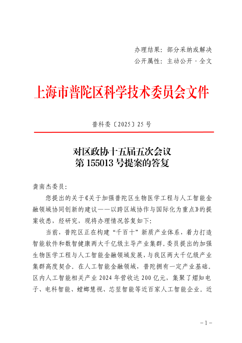 您提出的关于《关于加强普陀区生物医学工程与人工智能金融领域协同创新的建议——以跨区域协作与国际化为重点》的提案收悉,经研究,现将办理情况答复如下: