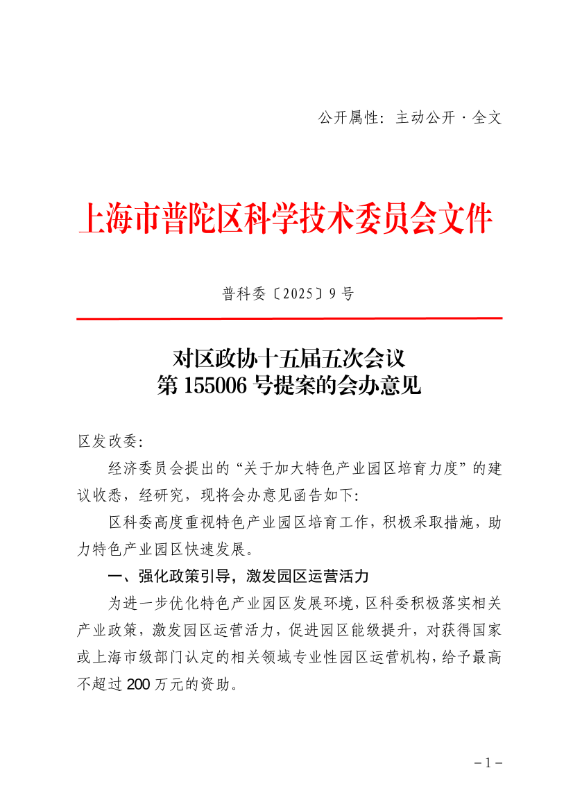 为进一步优化特色产业园区发展环境,区科委积极落实相关产业政策,激发园区运营活力,促进园区能级提升,对获得国家或上海市级部门认定的相关领域专业性园区运营机构,给予最高不超过200万元的资助。