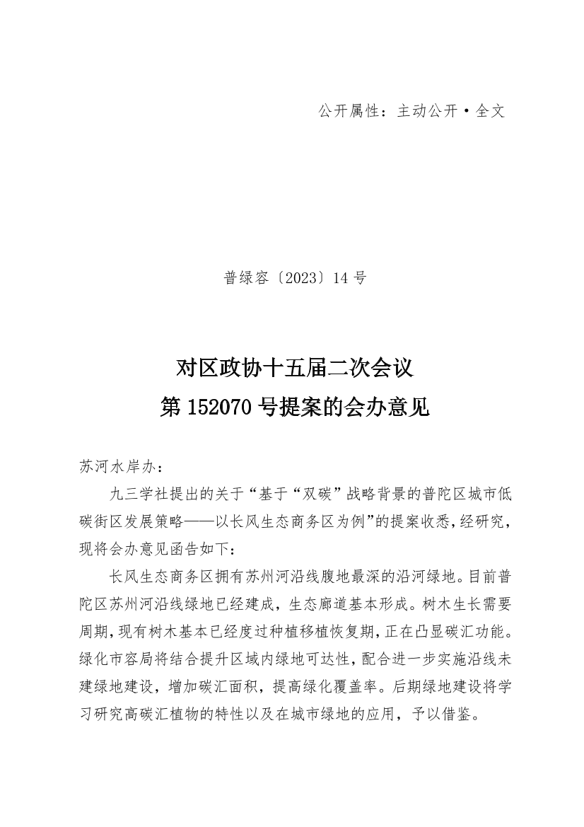九三学社提出的关于“基于“双碳”战略背景的普陀区城市低碳街区发展策略——以长风生态商务区为例”的提案收悉,经研究,现将会办意见函告如下: