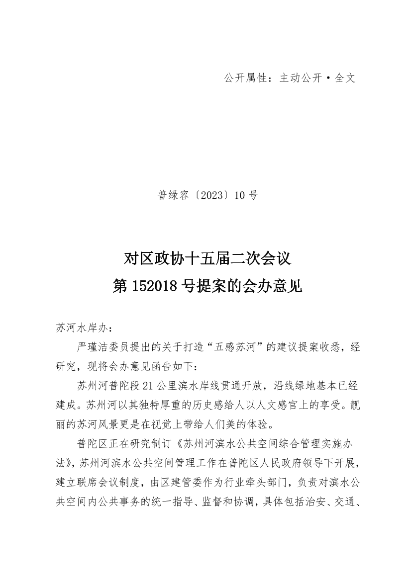 对区政协十五届二次会议第152018号提案的会办意见