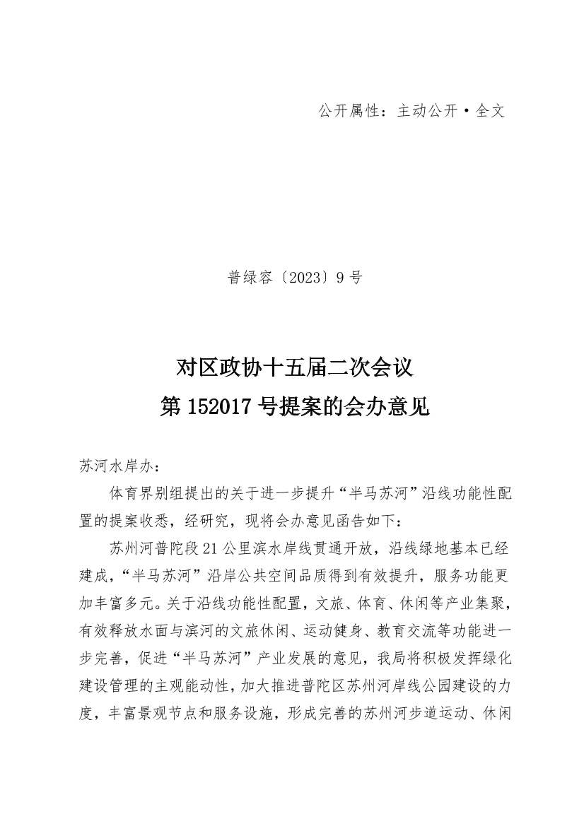 体育界别组提出的关于进一步提升“半马苏河”沿线功能性配置的提案收悉,经研究,现将会办意见函告如下: