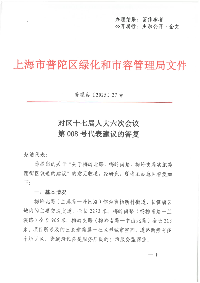 你提出的关于“关于梅岭北路、梅岭南路、梅岭支路实施美丽街区改造的建议”的意见收悉,经研究,现将主办意见答复如下: