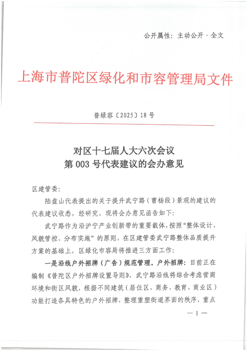 陆盘山代表提出的关于提升武宁路(曹杨段)景观的建议的代表建议收悉,经研究,现将会办意见函告如下: