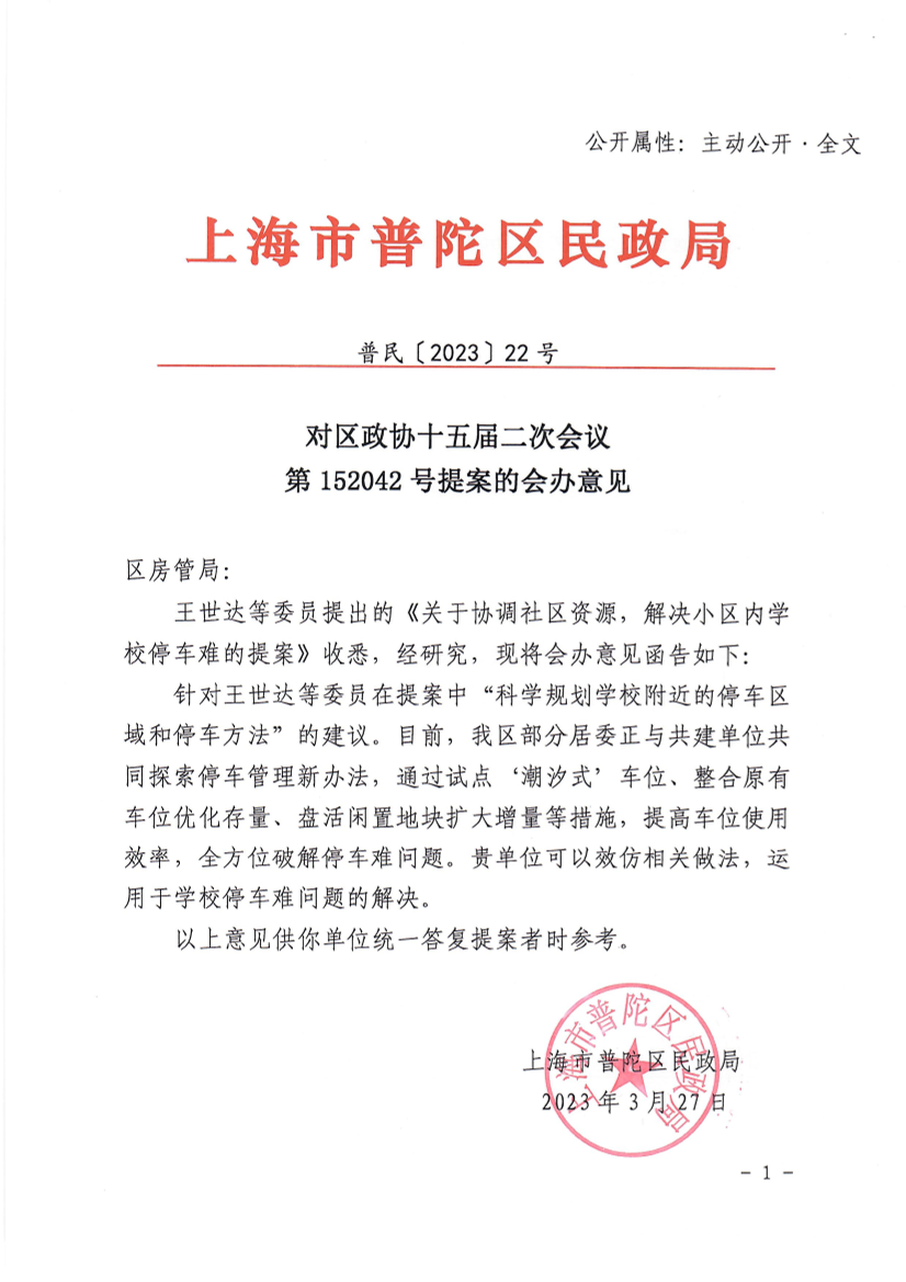 针对王世达等委员在提案中“科学规划学校附近的停车区域和停车方法”的建议。目前,我区部分居委正与共建单位共同探索停车管理新办法,通过试点‘潮汐式’车位、整合原有车位优化存量、盘活闲置地块扩大增量等措施,提高车位使用效率,全方位破解停车难问题。贵单位可以效仿相关做法,运用于学校停车难问题的解决。