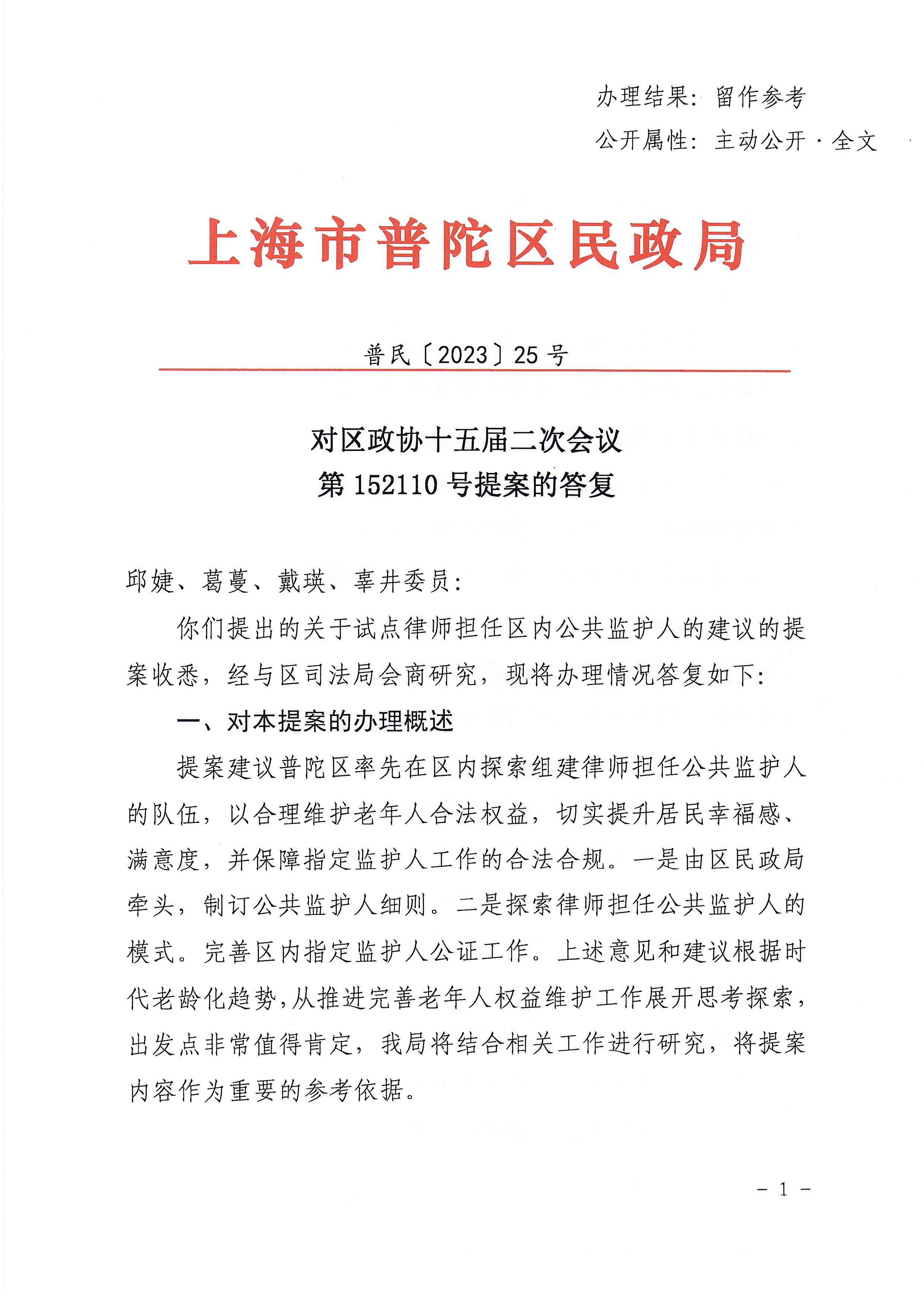 提案建议普陀区率先在区内探索组建律师担任公共监护人的队伍,以合理维护老年人合法权益,切实提升居民幸福感、满意度,并保障指定监护人工作的合法合规。一是由区民政局牵头,制订公共监护人细则。二是探索律师担任公共监护人的模式。完善区内指定监护人公证工作。上述意见和建议根据时代老龄化趋势,从推进完善老年人权益维护工作展开思考探索,出发点非常值得肯定,我局将结合相关工作进行研究,将提案内容作为重要的参考依据。
