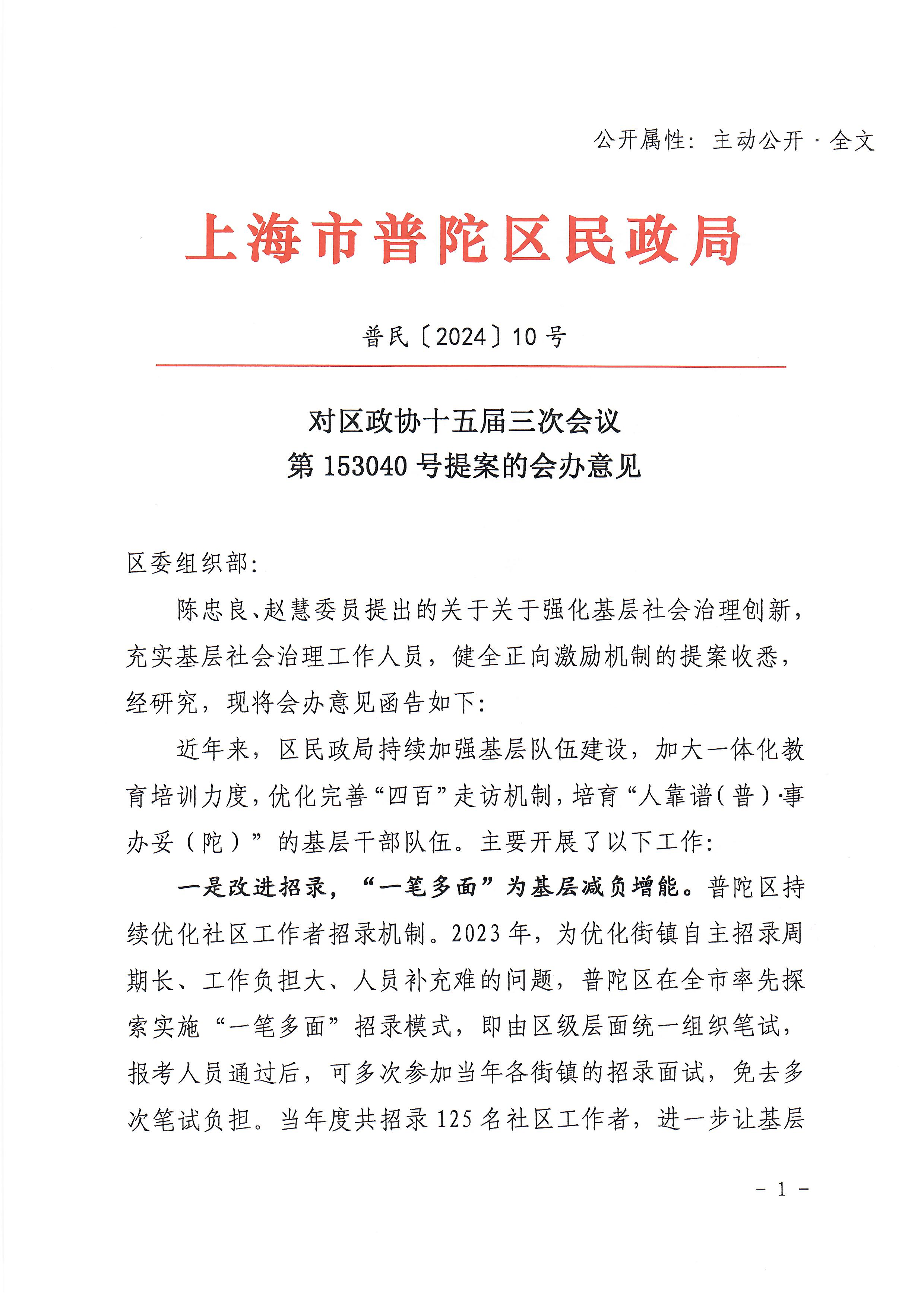 一是改进招录,“一笔多面”为基层减负增能。普陀区持续优化社区工作者招录机制。2023年,为优化街镇自主招录周期长、工作负担大、人员补充难的问题,普陀区在全市率先探索实施“一笔多面”招录模式,即由区级层面统一组织笔试,报考人员通过后,可多次参加当年各街镇的招录面试,免去多次笔试负担。当年度共招录125名社区工作者,进一步让基层减负增能。