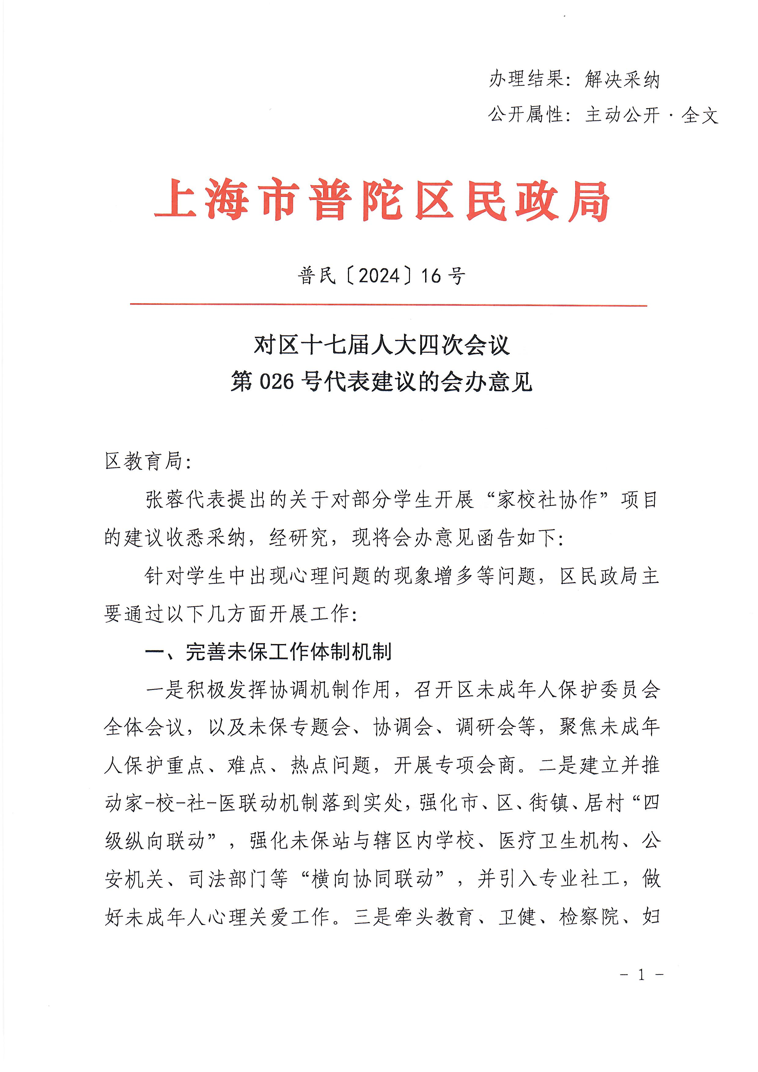 张蓉代表提出的关于对部分学生开展“家校社协作”项目的建议收悉采纳,经研究,现将会办意见函告如下: