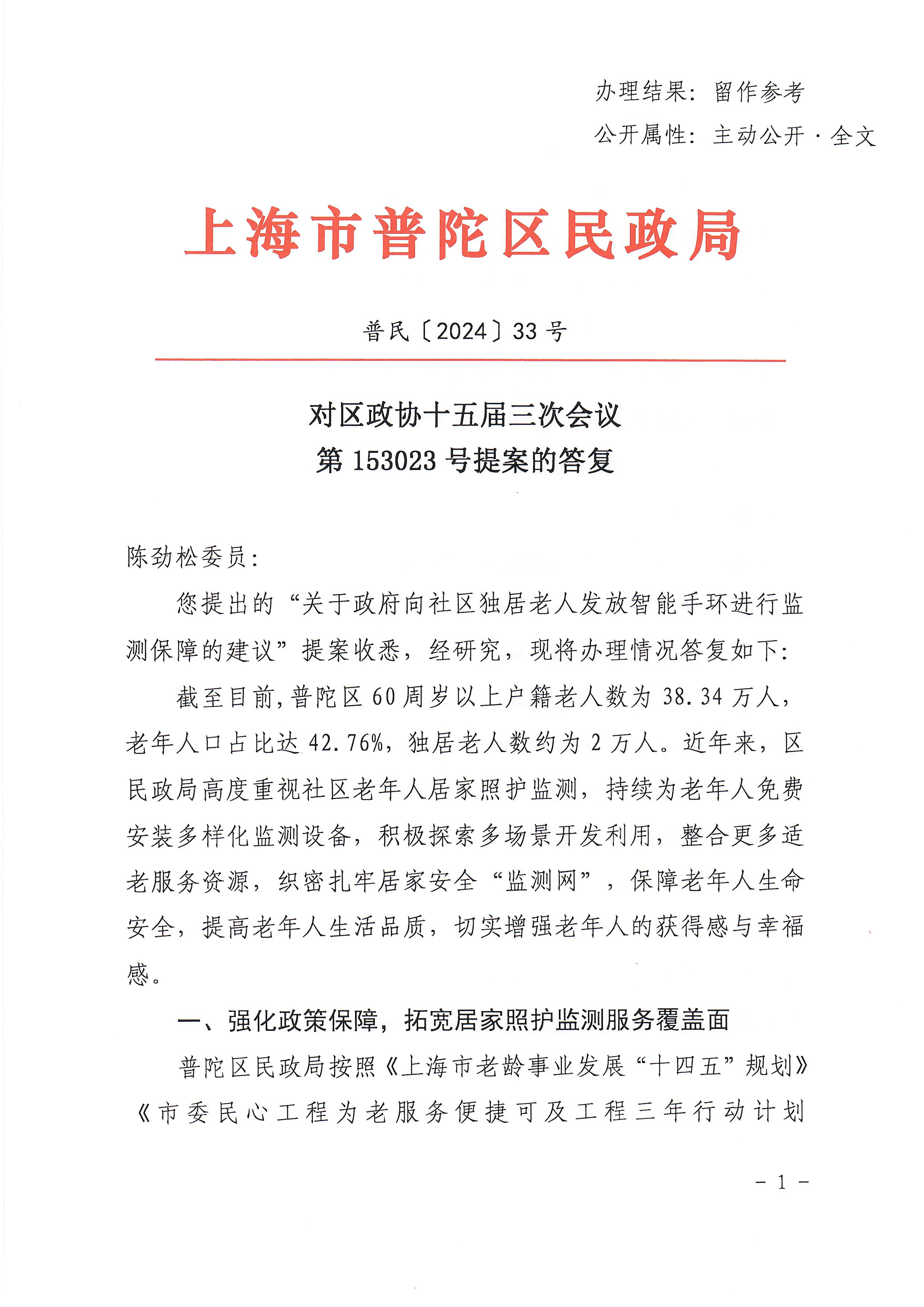 您提出的“关于政府向社区独居老人发放智能手环进行监测保障的建议”提案收悉,经研究,现将办理情况答复如下: