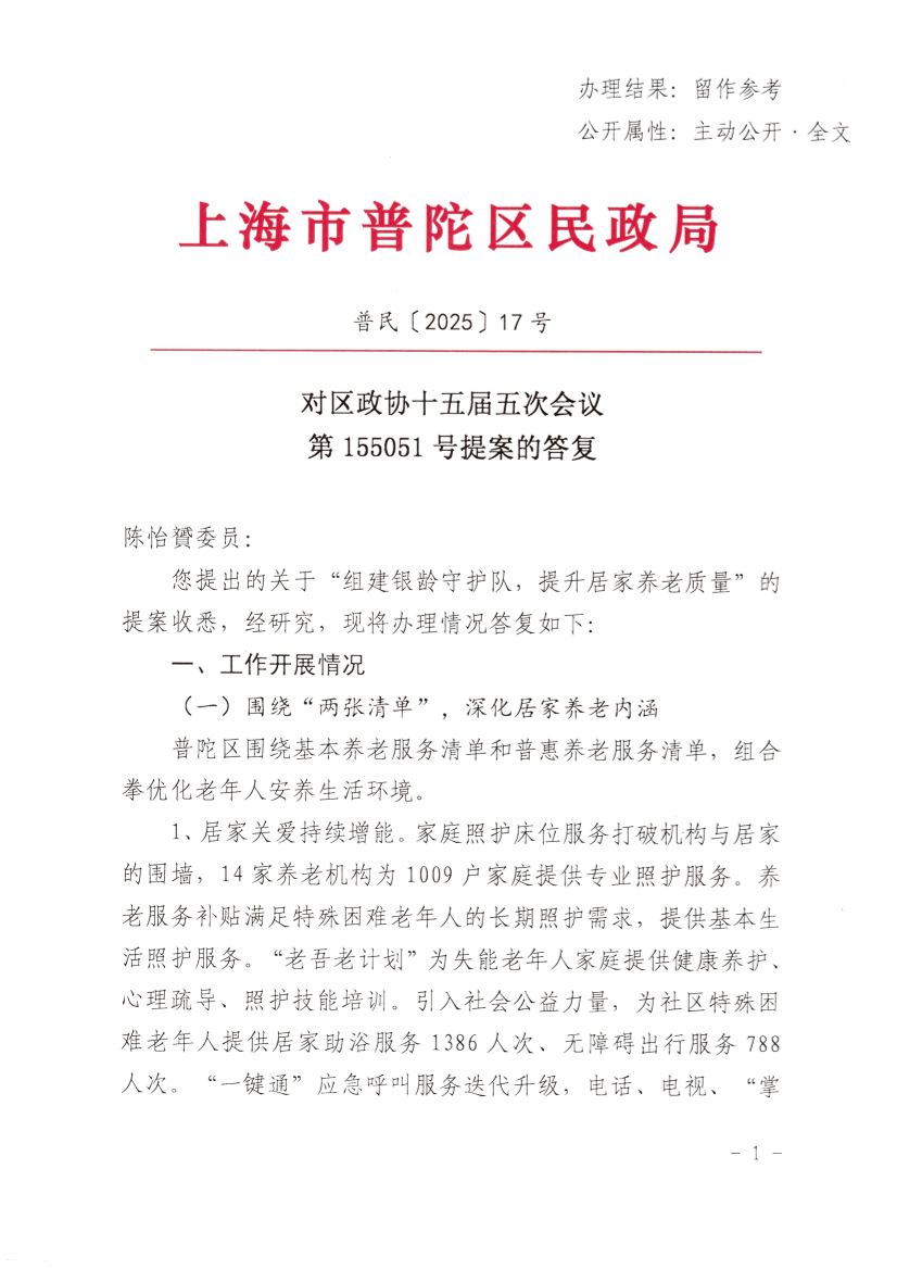 您提出的关于“组建银龄守护队,提升居家养老质量”的提案收悉,经研究,现将办理情况答复如下: