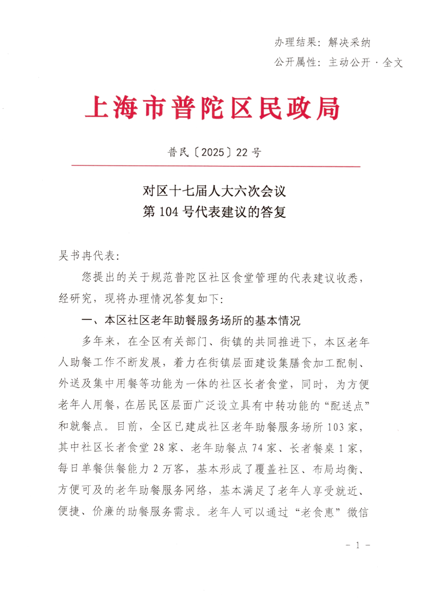 您提出的关于规范普陀区社区食堂管理的代表建议收悉,经研究,现将办理情况答复如下: