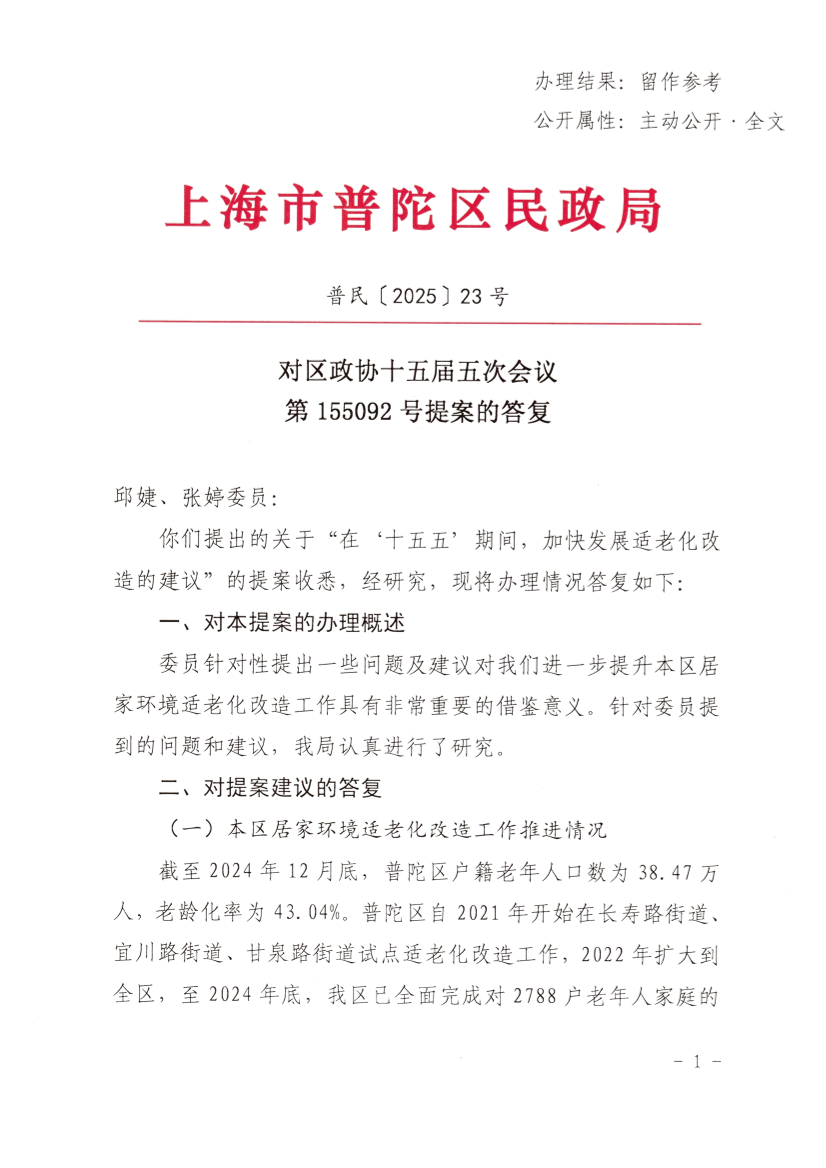 你们提出的关于“在‘十五五’期间,加快发展适老化改造的建议”的提案收悉,经研究,现将办理情况答复如下: