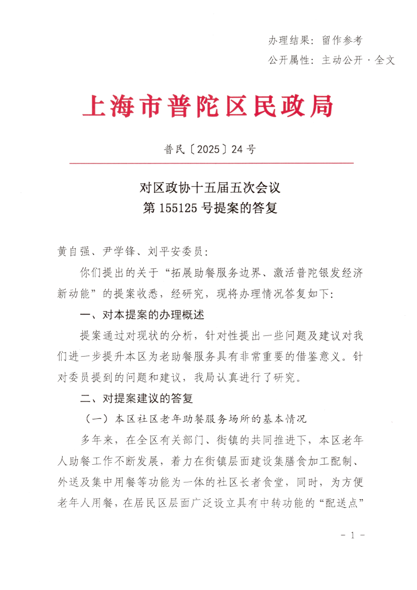 你们提出的关于“拓展助餐服务边界、激活普陀银发经济新动能”的提案收悉,经研究,现将办理情况答复如下: