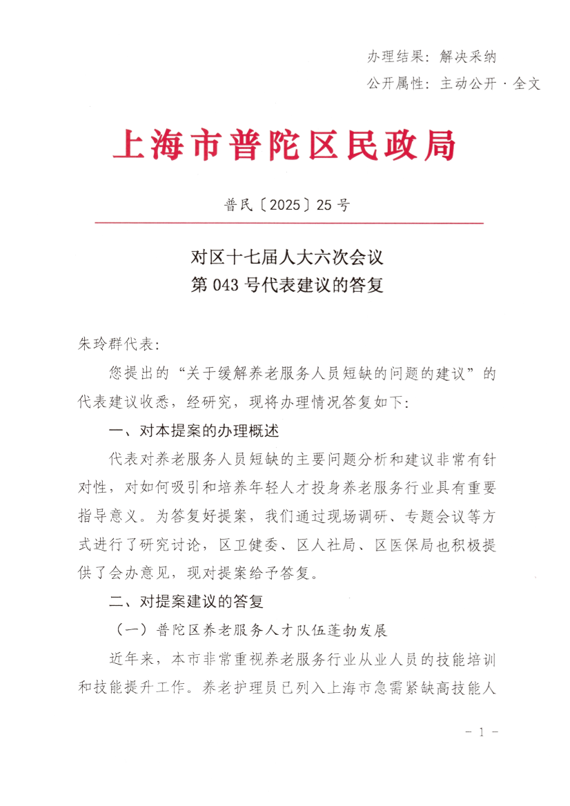 代表对养老服务人员短缺的主要问题分析和建议非常有针对性,对如何吸引和培养年轻人才投身养老服务行业具有重要指导意义。为答复好提案,我们通过现场调研、专题会议等方式进行了研究讨论,区卫健委、区人社局、区医保局也积极提供了会办意见,现对提案给予答复。