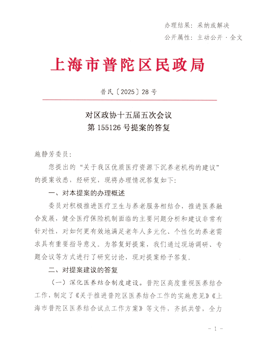 您提出的“关于我区优质医疗资源下沉养老机构的建议”的提案收悉,经研究,现将办理情况答复如下: