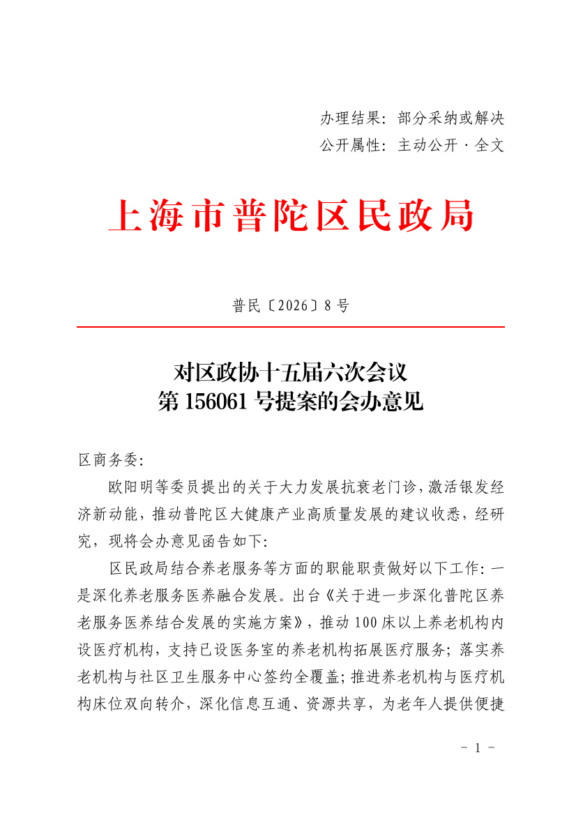 欧阳明等委员提出的关于大力发展抗衰老门诊,激活银发经济新动能,推动普陀区大健康产业高质量发展的建议收悉,经研究,现将会办意见函告如下: