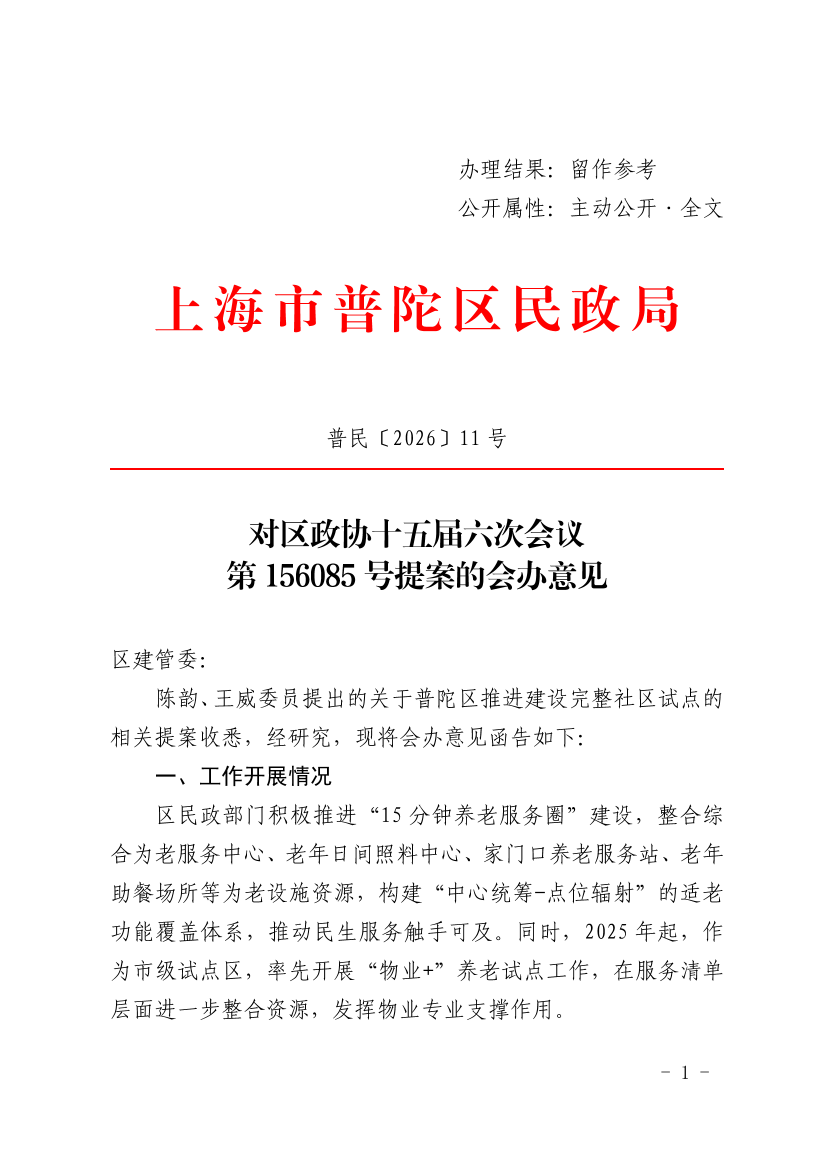 陈韵、王威委员提出的关于普陀区推进建设完整社区试点的相关提案收悉,经研究,现将会办意见函告如下: