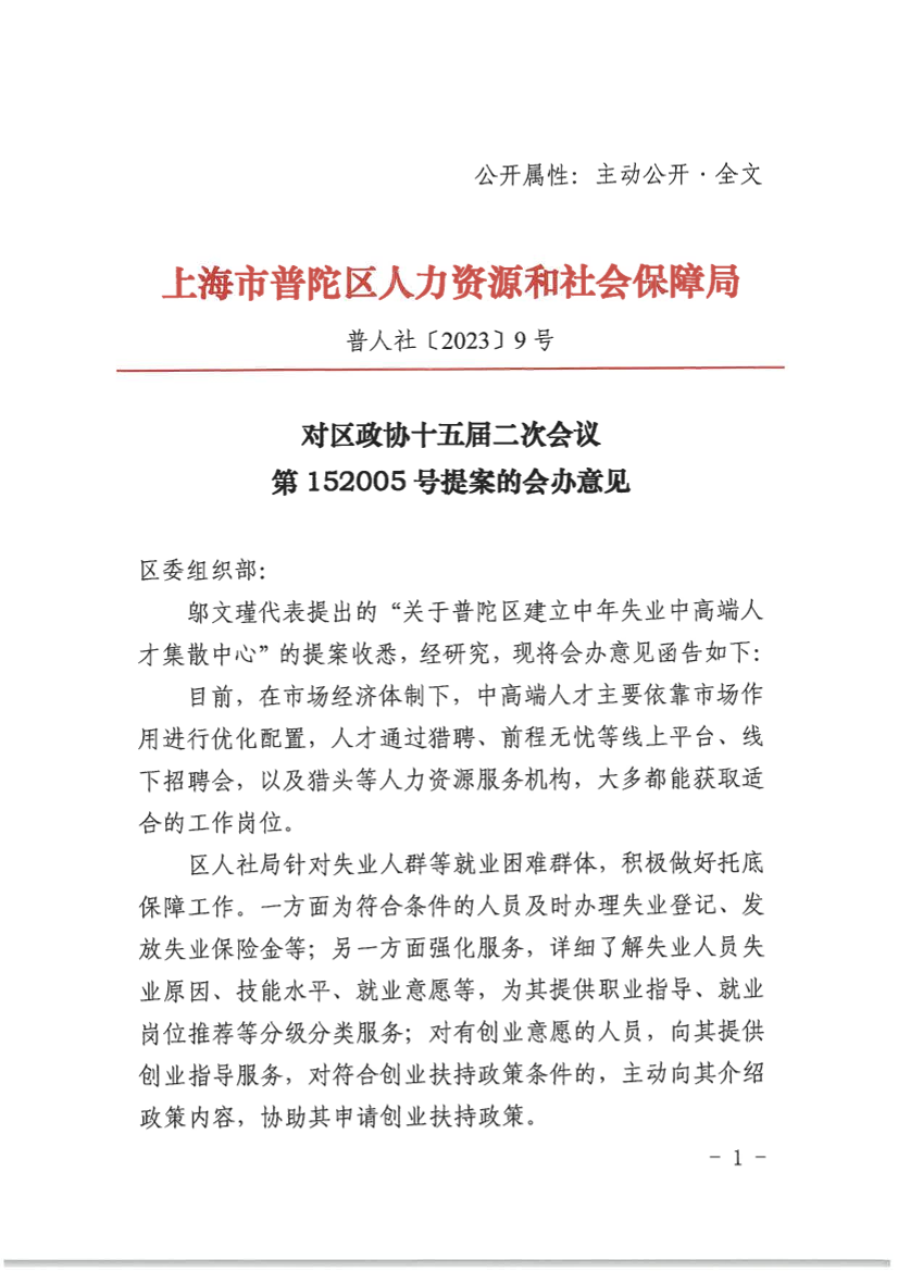 邬文瑾代表提出的“关于普陀区建立中年失业中高端人才集散中心”的提案收悉,经研究,现将会办意见函告如下: