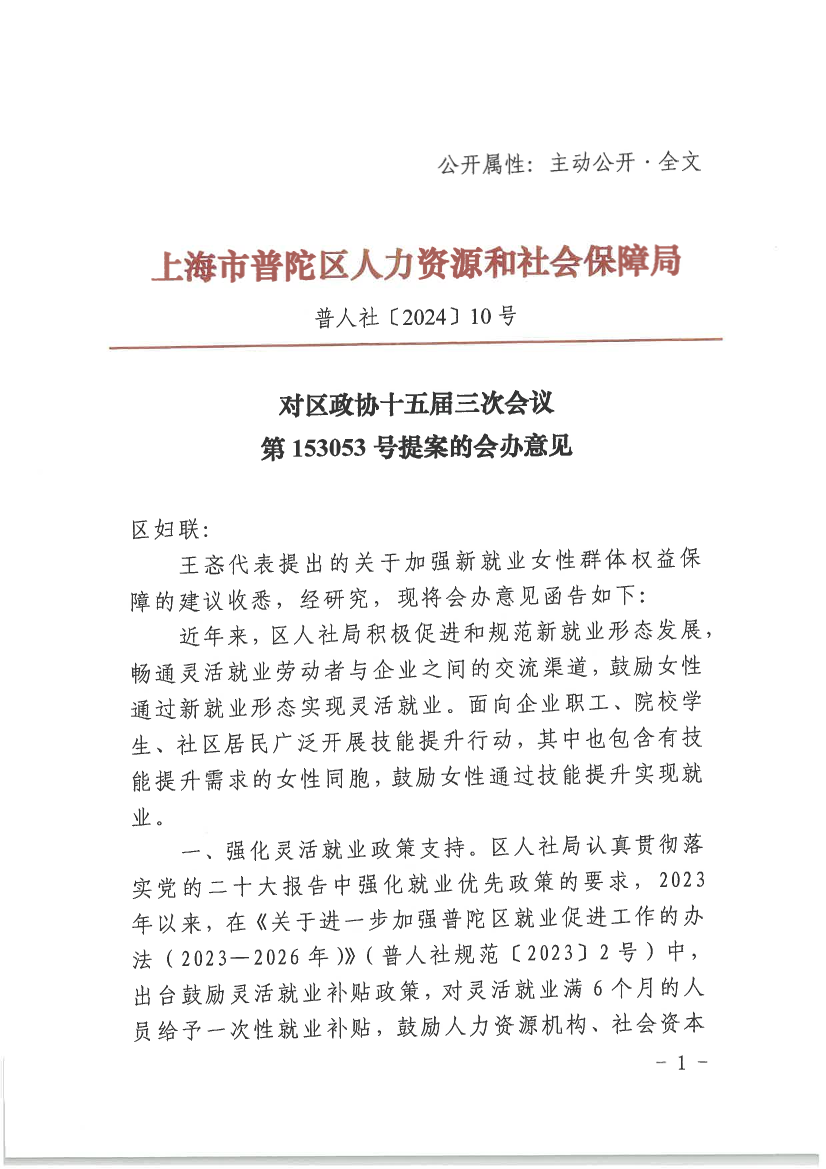一、强化灵活就业政策支持。区人社局认真贯彻落实党的二十大报告中强化就业优先政策的要求,2023年以来,在《关于进一步加强普陀区就业促进工作的办法(2023—2026年)》(普人社规范〔2023〕2号)中,出台鼓励灵活就业补贴政策,对灵活就业满6个月的人员给予一次性就业补贴,鼓励人力资源机构、社会资本和优质服务资源提供灵活就业岗位信息,支持女性从事新就业形态的灵活就业。