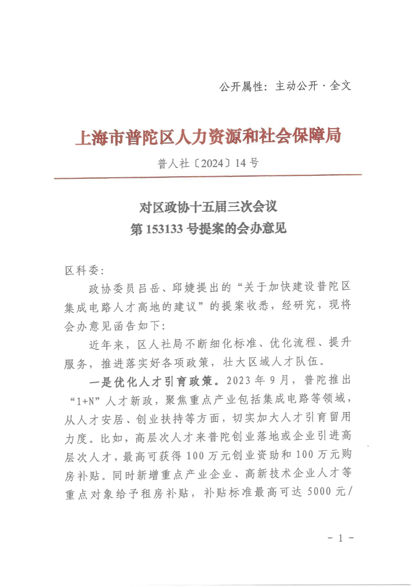 政协委员吕岳、邱婕提出的“关于加快建设普陀区集成电路人才高地的建议”的提案收悉,经研究,现将会办意见函告如下: