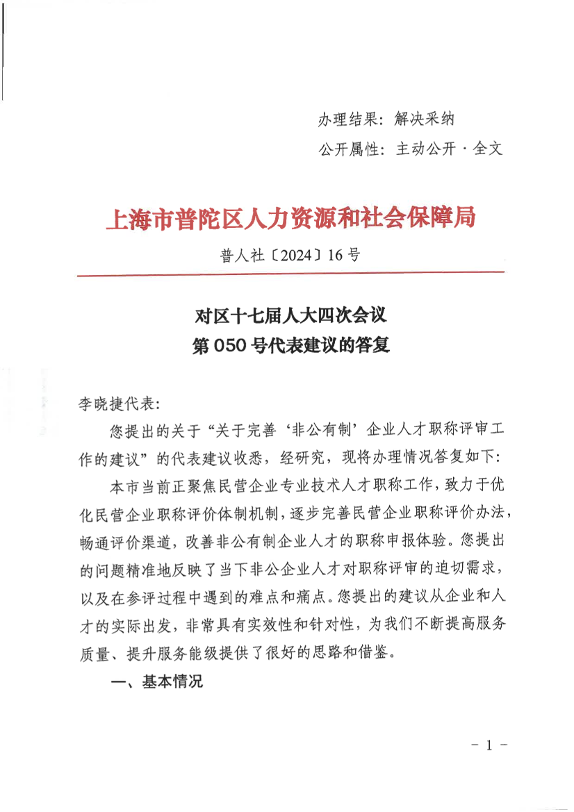 您提出的关于“关于完善‘非公有制’企业人才职称评审工作的建议”的代表建议收悉,经研究,现将办理情况答复如下:
