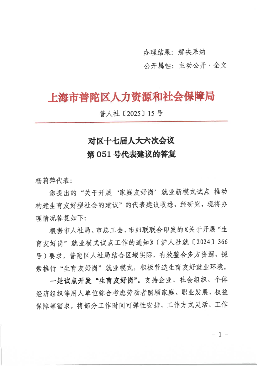 您提出的“关于开展‘家庭友好岗’就业新模式试点 推动构建生育友好型社会的建议”的代表建议收悉,经研究,现将办理情况答复如下: