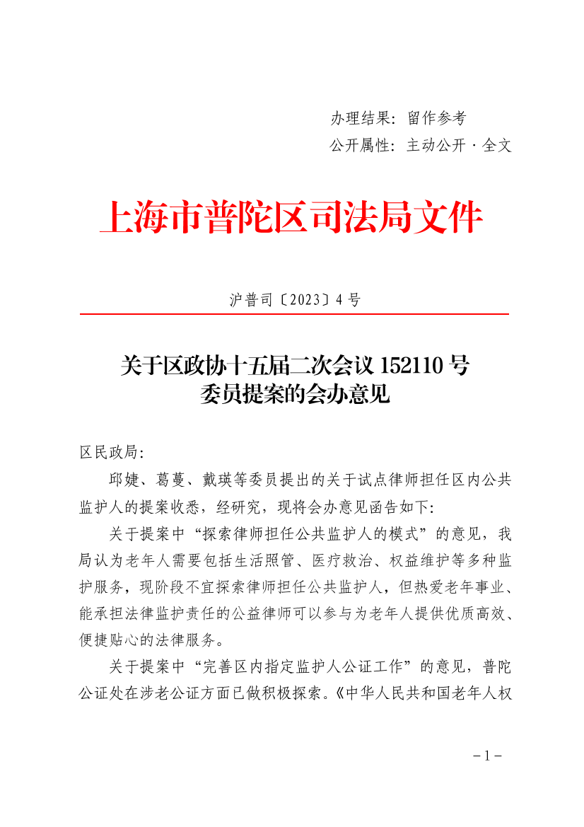 关于提案中“完善区内指定监护人公证工作”的意见,普陀公证处在涉老公证方面已做积极探索。《中华人民共和国老年人权益保障法》、《民法典》虽已确立意定监护制度,但缺乏相应的实施细则,意定监护存在较高的法律风险,不宜开展。
