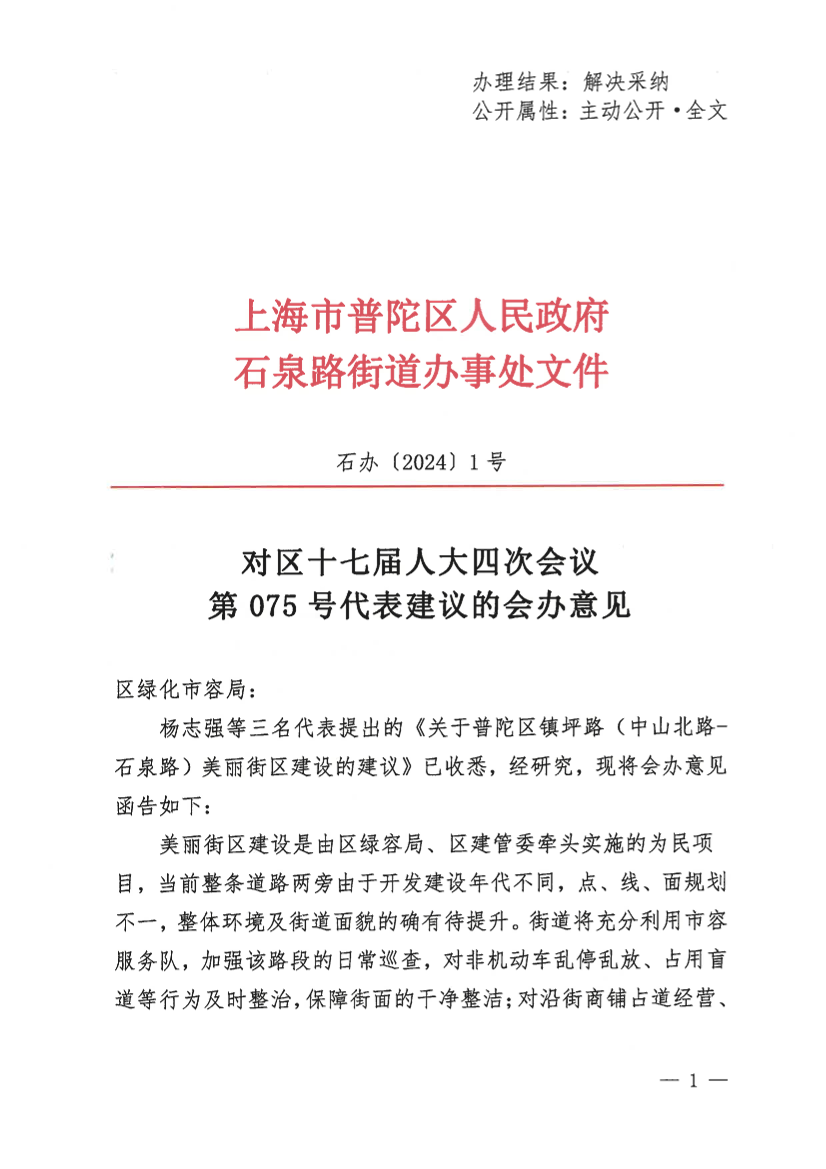 杨志强等三名代表提出的《关于普陀区镇坪路(中山北路-石泉路)美丽街区建设的建议》已收悉,经研究,现将会办意见函告如下: