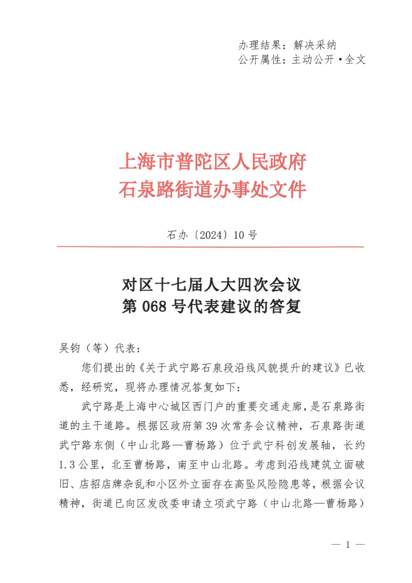 您们提出的《关于武宁路石泉段沿线风貌提升的建议》已收悉,经研究,现将办理情况答复如下:
