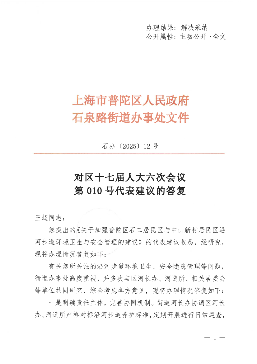 您提出的《关于加强普陀区石二居民区与中山新村居民区沿河步道环境卫生与安全管理的建议》的代表建议收悉,经研究,现将办理情况答复如下: