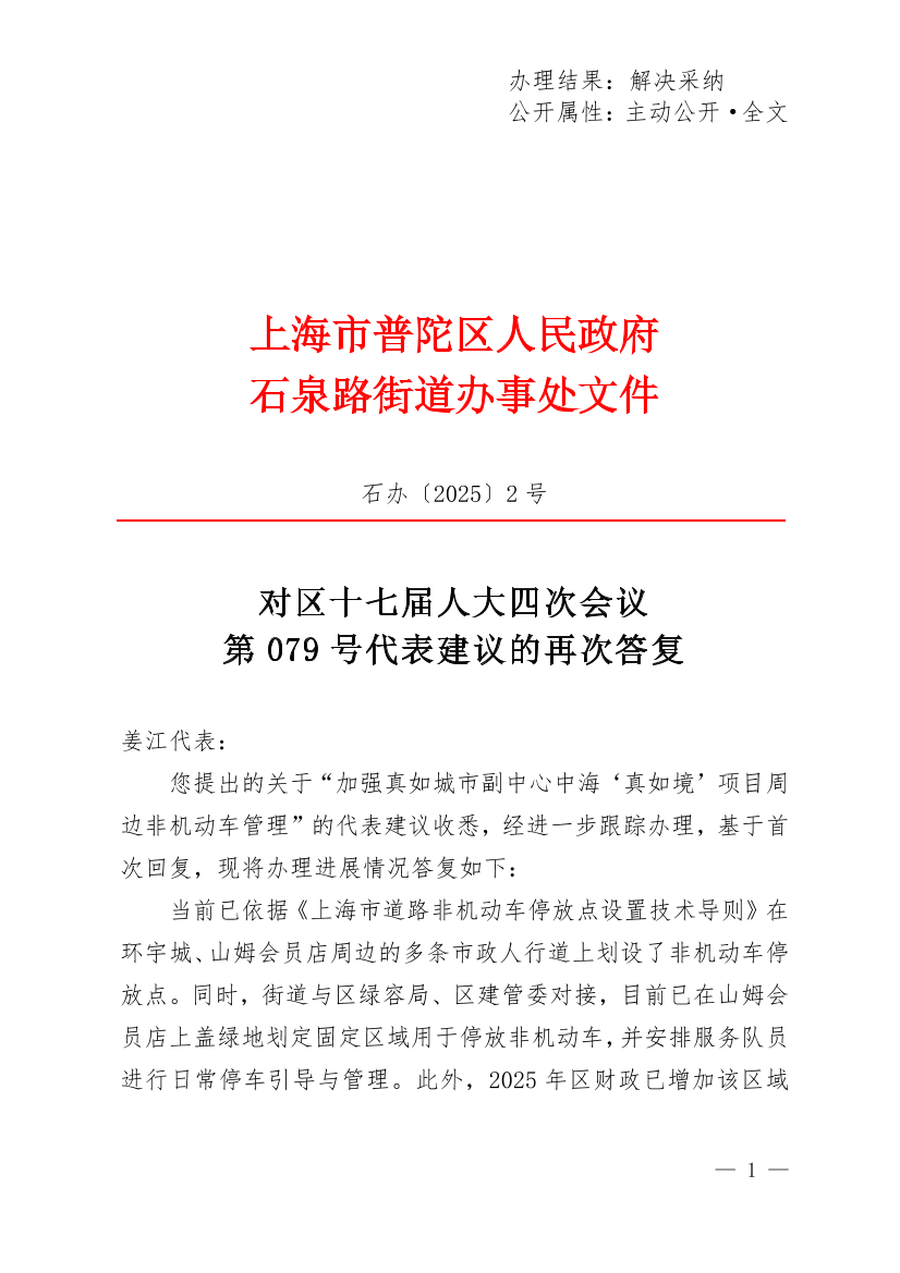 您提出的关于“加强真如城市副中心中海‘真如境’项目周边非机动车管理”的代表建议收悉,经进一步跟踪办理,基于首次回复,现将办理进展情况答复如下: