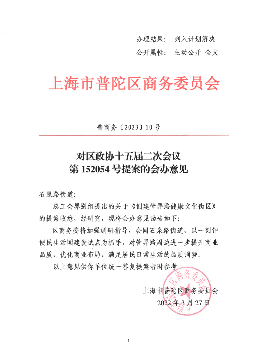 总工会界别组提出的关于《创建管弄路健康文化街区》的提案收悉,经研究,现将会办意见函告如下: