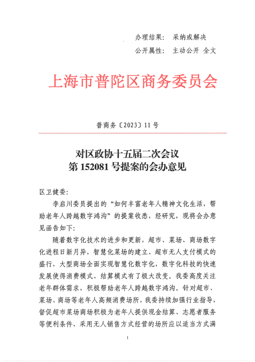 李启川委员提出的“如何丰富老年人精神文化生活,帮助老年人跨越数字鸿沟”的提案收悉,经研究,现将会办意见函告如下: