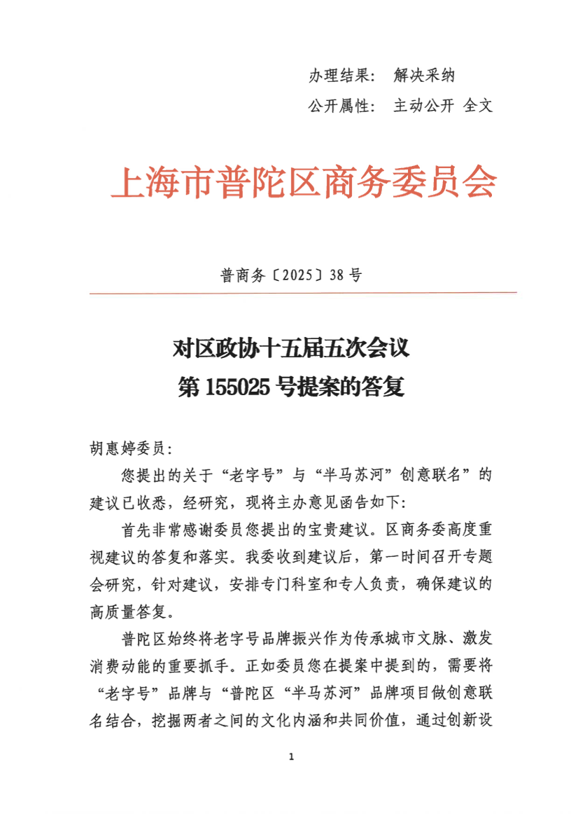 您提出的关于“老字号”与“半马苏河”创意联名”的建议已收悉,经研究,现将主办意见函告如下: