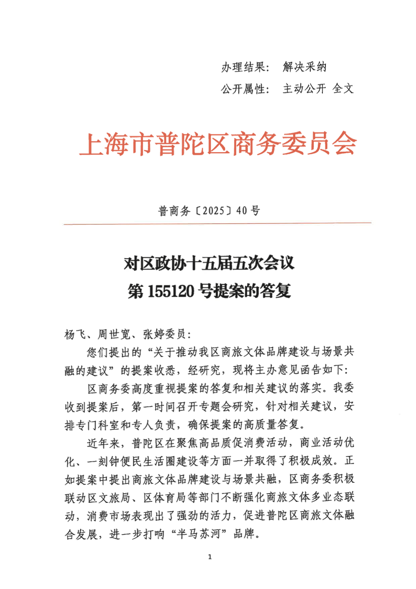 近年来,普陀区在聚焦高品质促消费活动,商业活动优化、一刻钟便民生活圈建设等方面一并取得了积极成效。正如提案中提出商旅文体品牌建设与场景共融,区商务委积极联动区文旅局、区体育局等部门不断强化商旅文体多业态联动,消费市场表现出了强劲的活力,促进普陀区商旅文体融合发展,进一步打响“半马苏河”品牌。