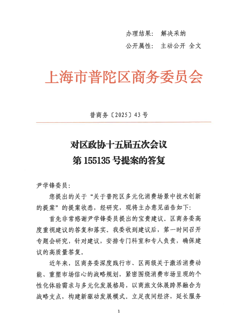您提出的关于“关于普陀区多元化消费场景中技术创新的提案”的提案收悉,经研究,现将主办意见函告如下: