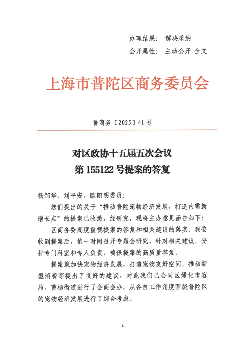 提案就加快宠物经济发展,打造宠物友好空间,推动新型消费等提出了良好的建议,对此我们已会同区绿化市容局、曹杨街道进行了会商会办,从各自工作角度围绕普陀区的宠物经济发展进行了综合考虑。