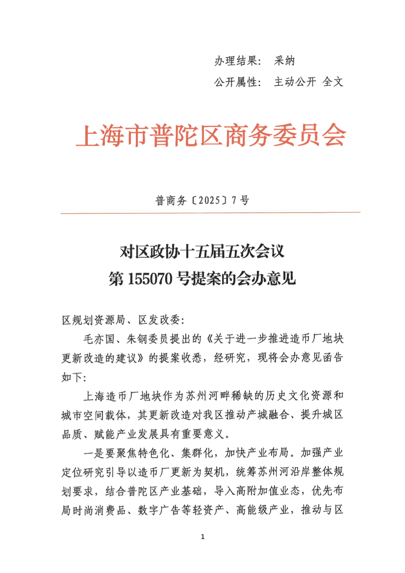 毛亦国、朱钢委员提出的《关于进一步推进造币厂地块更新改造的建议》的提案收悉,经研究,现将会办意见函告如下: