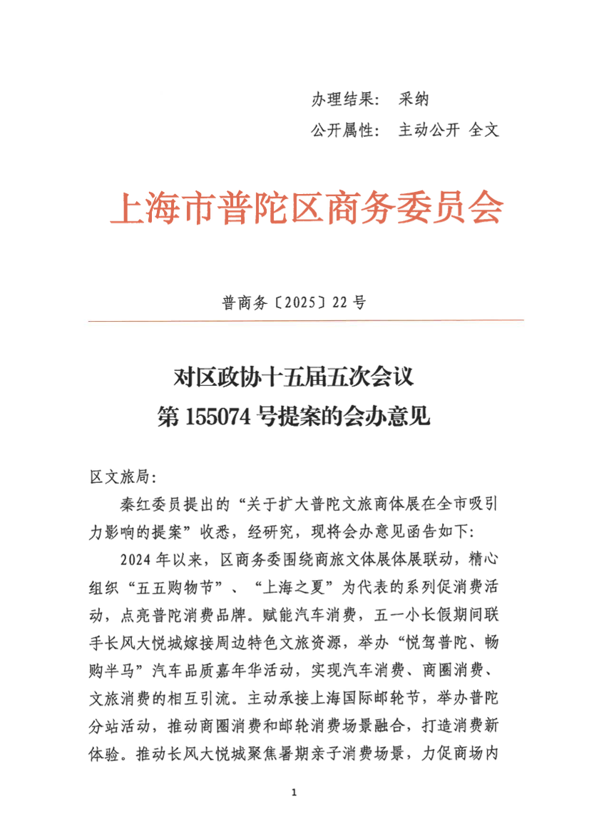 秦红委员提出的“关于扩大普陀文旅商体展在全市吸引力影响的提案”收悉,经研究,现将会办意见函告如下: