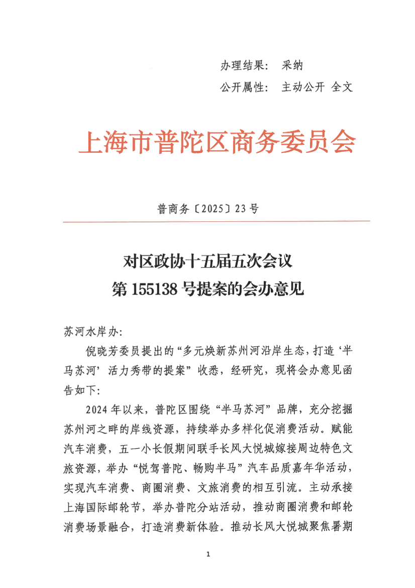 倪晓芳委员提出的“多元焕新苏州河沿岸生态,打造‘半马苏河’活力秀带的提案”收悉,经研究,现将会办意见函告如下:
